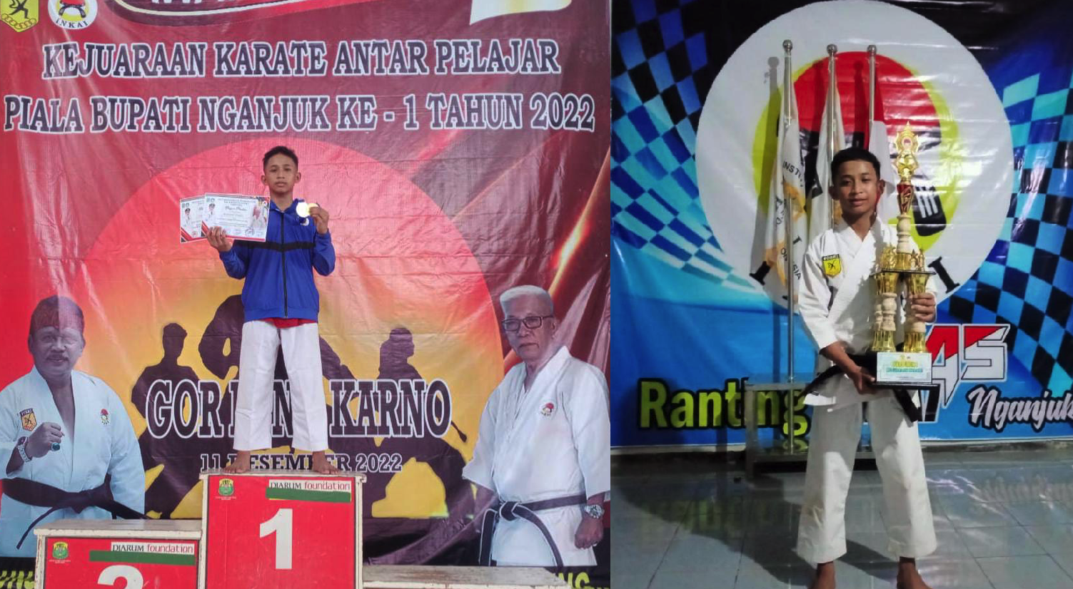 Wildan Satria Ady Ardana Kelas 7I mendapatkan Juara 1 Kumite BB-45 dan Juara 2 Kata Perorangan Piala Bupati Nganjuk Cabor Karate.
