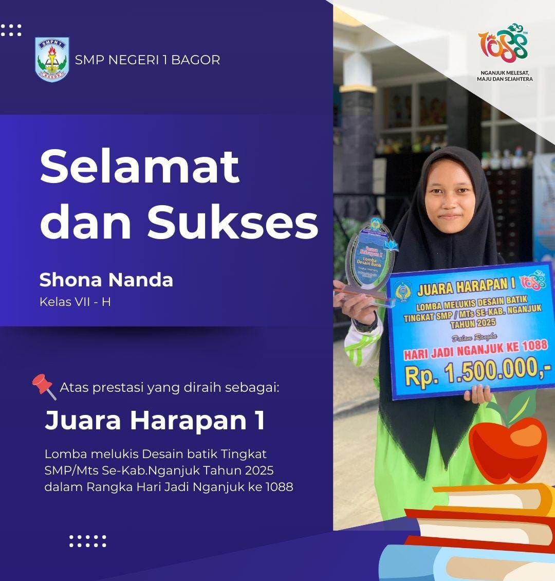 Shona Nanda Kelas VIII-H mendapatkan juara Harapan 1 pada Lomba melukis Desain batik Tingkat SMP/MTs Se-Kab. Nganjuk Tahun 2025 dalam Rangka Hari Jadi Nganjuk ke 1088.